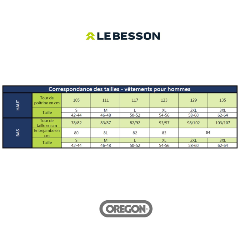 EN ISO 11393-2 Classe 1 Type A (20 m/s) : norme européenne relative aux vêtements de protection contre les coupures de tronçonneuse. La Classe 1 certifie une résistance à une vitesse de chaîne jusqu’à 20 m/s, tandis que le Type A protège la partie avant des jambes.